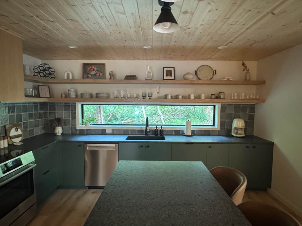 Open shelving, retro finishes, coffee maker, propane BBQ